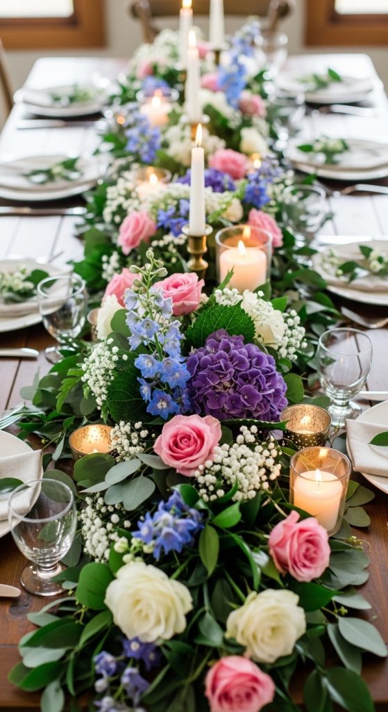 A floral or greenery garland runs down the center of the table with decorative accents added throughout.