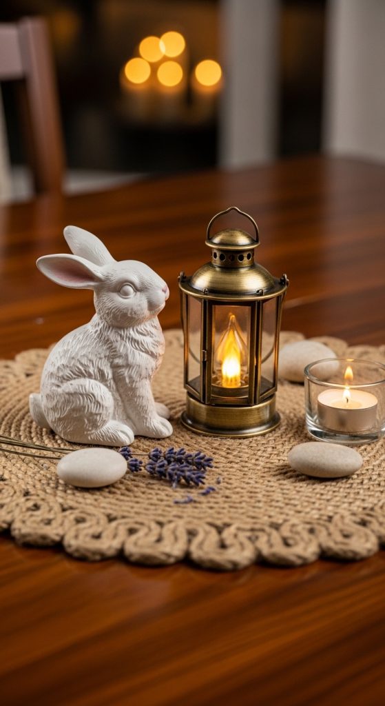 A lantern serves as the focal point, with bunny figurines and greenery arranged around it.