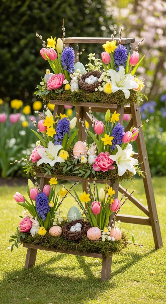 A multi-level stand is decorated with florals, eggs, and small bunny accents.
