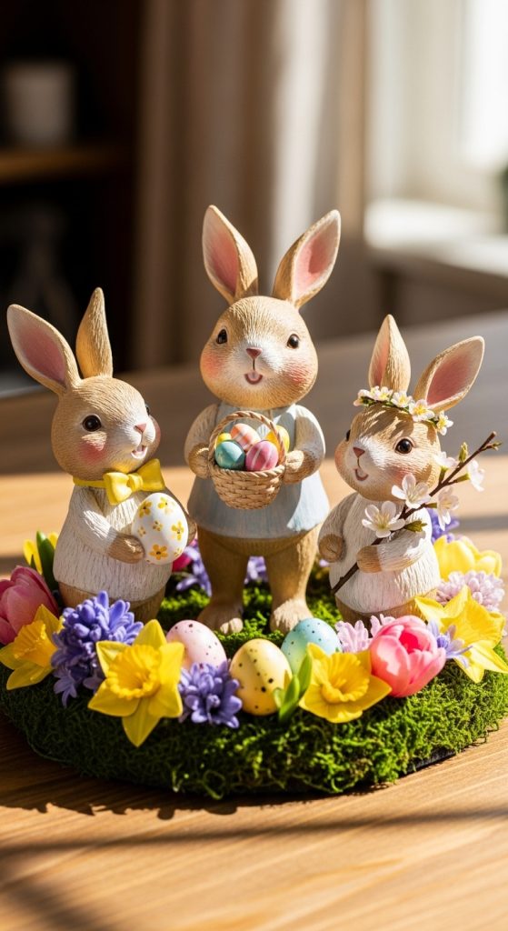 A trio of bunny figurines creates a balanced and visually pleasing table display. Pinterest users love symmetrical arrangements for elegant Easter decor.
