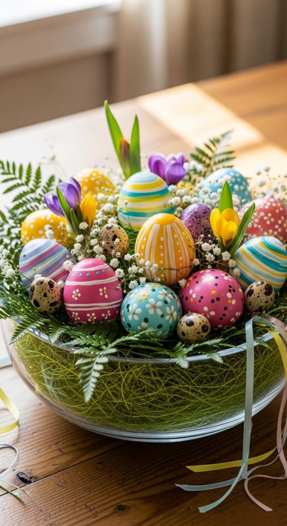 A large decorative bowl is filled with pastel Easter eggs and moss for texture.